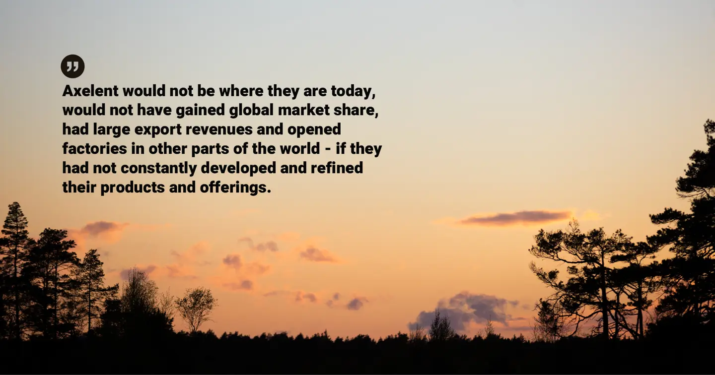 "Hay algo especial en empresas como Axelent”, donde los fundadores siguen trabajando activamente en la empresa. Esto significa que valores como la innovación y la sostenibilidad tendrán un impacto en toda operación.  No habría ganado su cuota de mercado global, tenido sus grandes ingresos de exportación y abierto fábricas en otras partes del mundo, si no hubiera desarrollado y perfeccionado constantemente sus productos y ofertas.